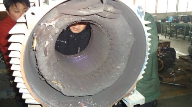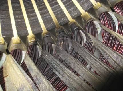 绕组全部变黑色,端部扎带变色并且变脆甚至断裂。
